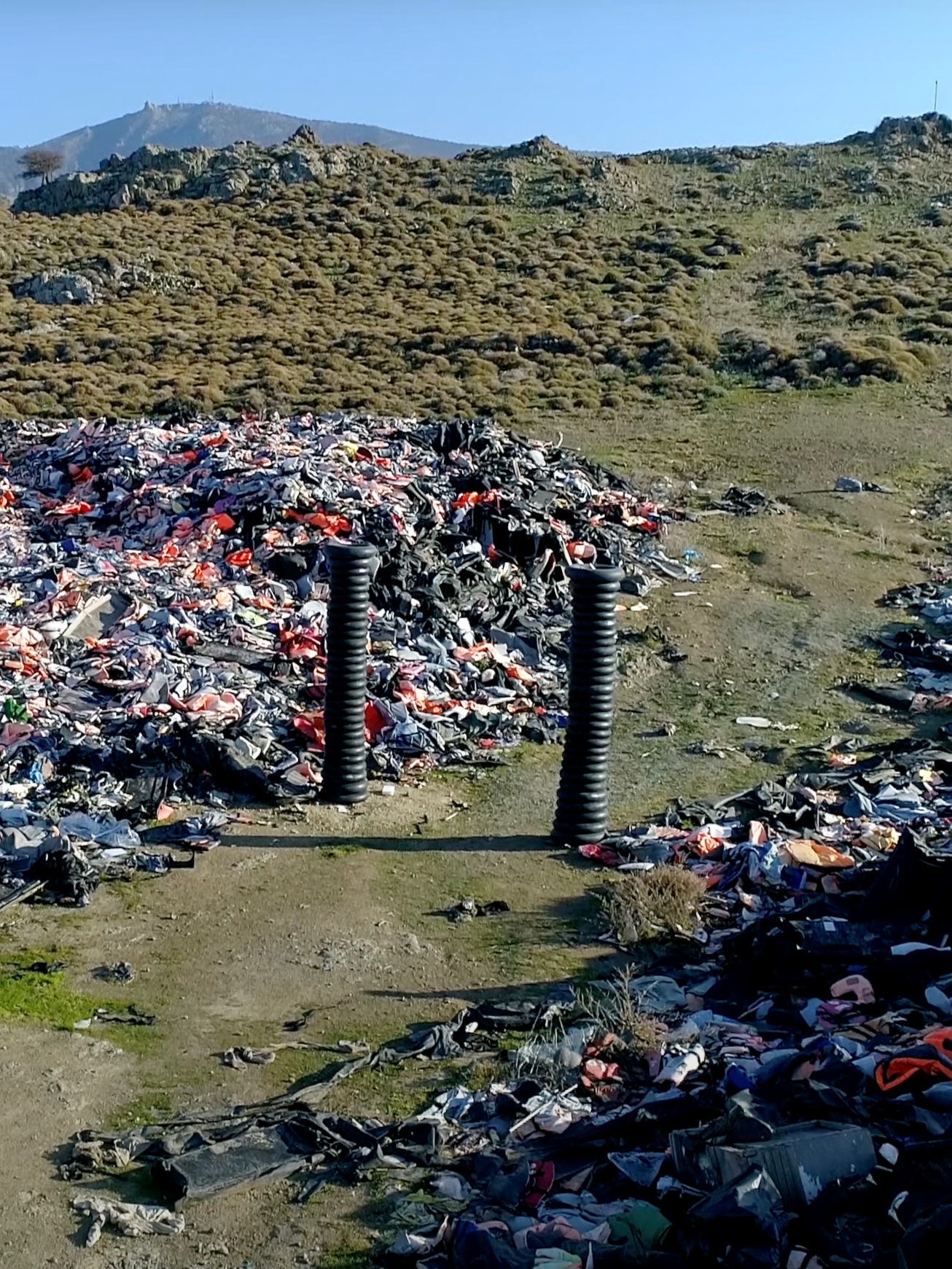 Continuing the common thread of – The Drama, in January 2020, with the artist, Andrea Villa, Magaldi went to the island of Lesbos, which at that time hosted the largest refugee camp in Europe, at Mori, with terrible conditions and great suffering (twenty-two thousand migrants were crammed into a camp designed for only three thousand). He decided to create an installation with a strong emotional impact. The project was called – Europe/YourHope – (more homophony) which was set up on a site called – Life jacket Graveyard: a kind of scrapheap where the island’s waste collection service discharged all the remains of clothing, shoes, deflated rubber boats and improvised lifebuoys abandoned by migrants as they reached land; mountains of garbage piled several metres high. On this site the artists built two columns from lifebuoy inner tubes to create a symbolic representation of the Pillars of Hercules, with a 48-hour soundtrack from a monitor broadcasting a speech by the Greek Prime Minister, M?tsotak?s, who spoke of human rights and equality, that were transformed into a dark version of Beethoven’s – Ode to Joy. “The installation was aimed at making the public reflect on the oppression suffered by the migrants, inviting European public opinion to move beyond the – Pillars of Hercules’ of their diffidence towards others, and to react so that Europe could become a true land of hope for migrants”.