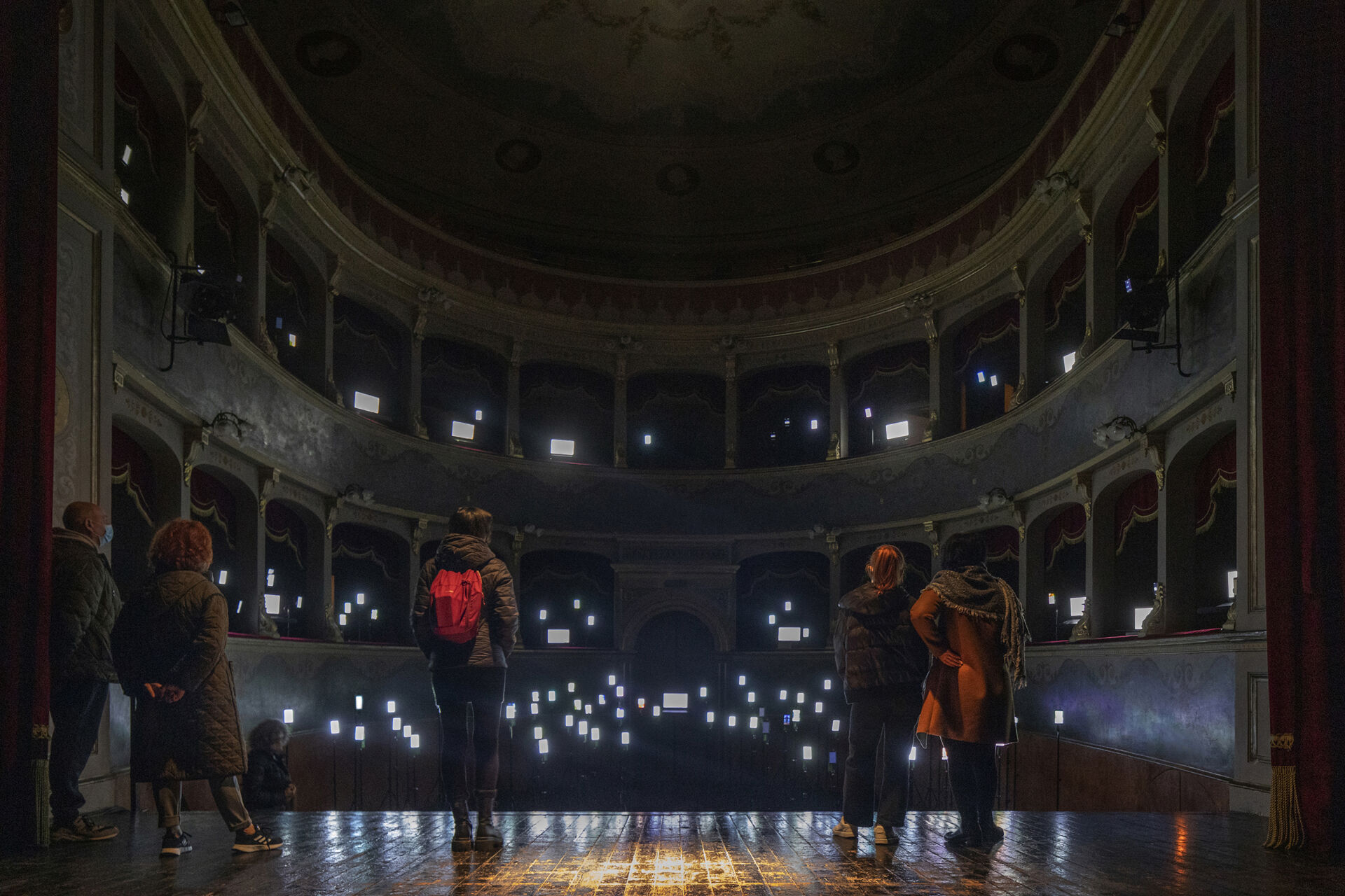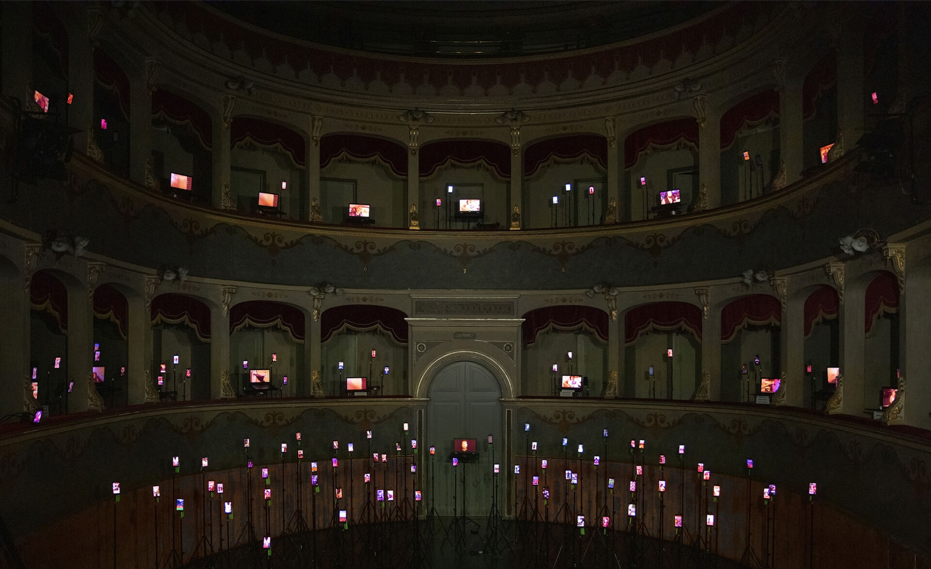 – The first enactment of Vainglory – was produced in December 2021 in the famous Petrella Theatre in Longiano, Forl – -Cesena. An orchestra was composed of a hundred and fifty phones and two hundred and twenty laptops, for which Magaldi selected content from a hundred and seventy different sources downloaded from social media; the users were all involved in different activities (dancing, preparing a recipe, teaching a tutorial, etc.). The devices lit up and provided the sound in the public space, while the dozens of social contents, manipulated by the artist, formed the soundtrack. In this way, the role of the theatre space was completely inverted: the public became the true protagonist of the production, while the stage remained empty. Magaldi described the scene: “During the performance, the public arrived from the rear; very gradually, the various devices were switched on, lighting up the stalls and gallery. The sense of the installation was to show that the masses are not composed of passive subjects but of constantly active creators: today, the public compulsively produces any and every type of content. For the first time in the history of humanity, we find ourselves in a period in which people tell their own stories or delude themselves that they are authors. We are in the era of self-narration. Apparently, there is no longer a need for an artist to describe society, because the public tells its own story”.