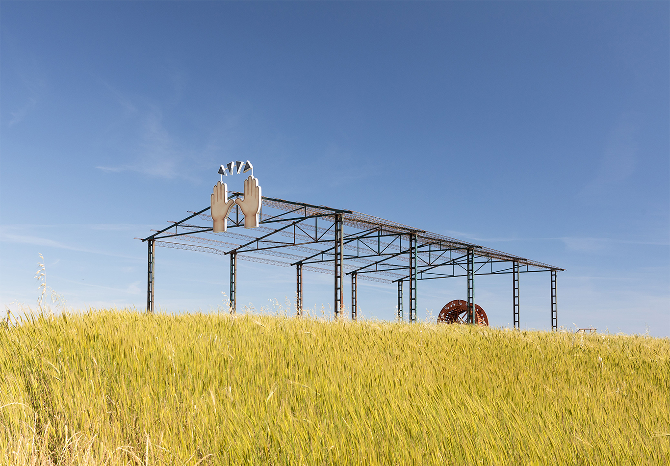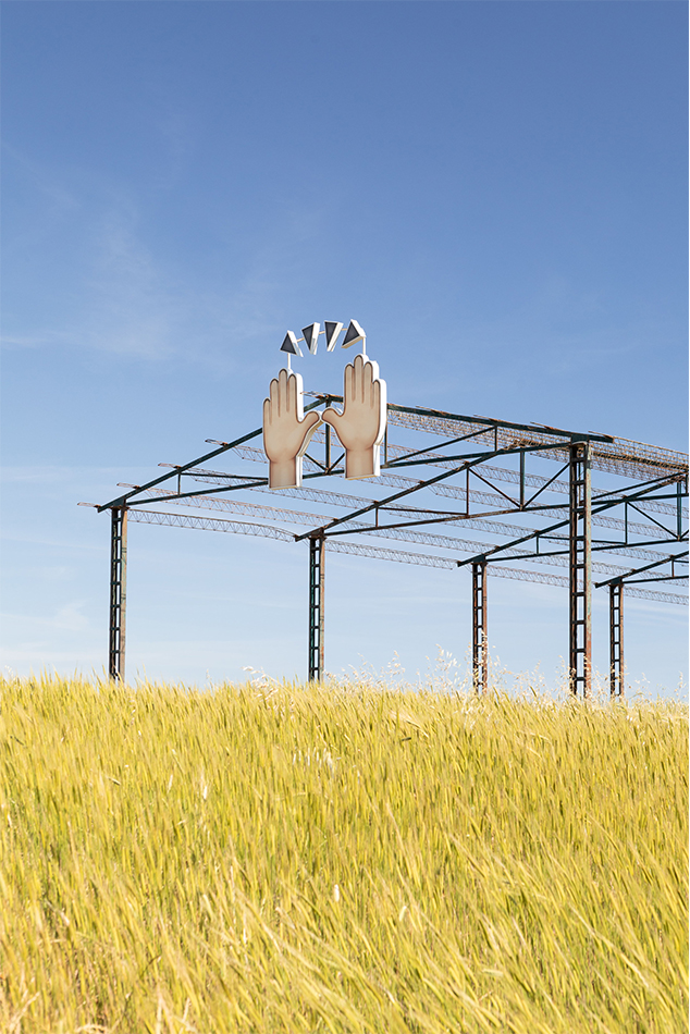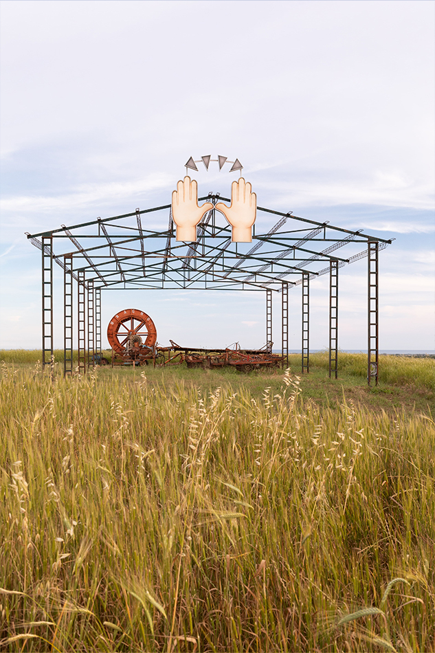 If you enter the coordinates 42.4437339 and 11.4855630 in digital maps, you will find an exact point in the wilds of the Maremma, at the top of a hill near the Fattoria Stendardi in Pescia Fiorentina, a place chosen by the artistic collective, neo-conceptual artist, Claire Fontaine for one of her works inspired by the language of emoticons and created for the sixth Hypermaremma Festival. On the top of an uncompleted structure, originally intended for rural use, the renowned ready-made – artist, who refuses the individuality of her two components, has installed the emoticon of raised hands, Left & Right, a “ready-made” symbol that is part of her latest research focussed on the emoticon language. In English, Emoticon is the combination of the words emotion and icon, or Emoji, in Japanese. They represent the tiny icons used in digital communication, According to Claire Fontaine: “they are our hieroglyphics, pictograms to describe the spiritual and the trivial”. According to the collective, emoticons are used specifically to “describe emotions in the absence of the body or the voice, when words may seem inadequate”.