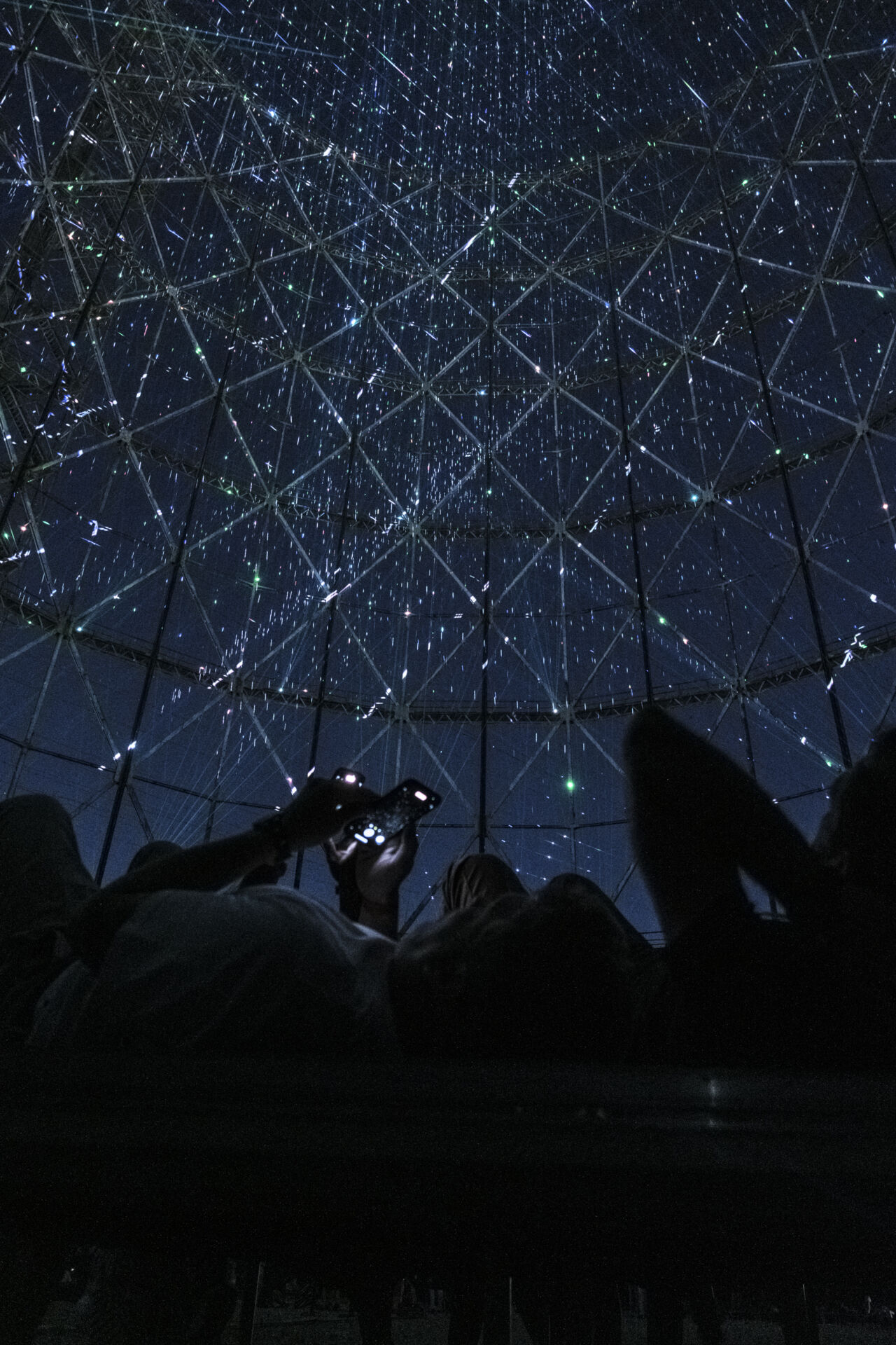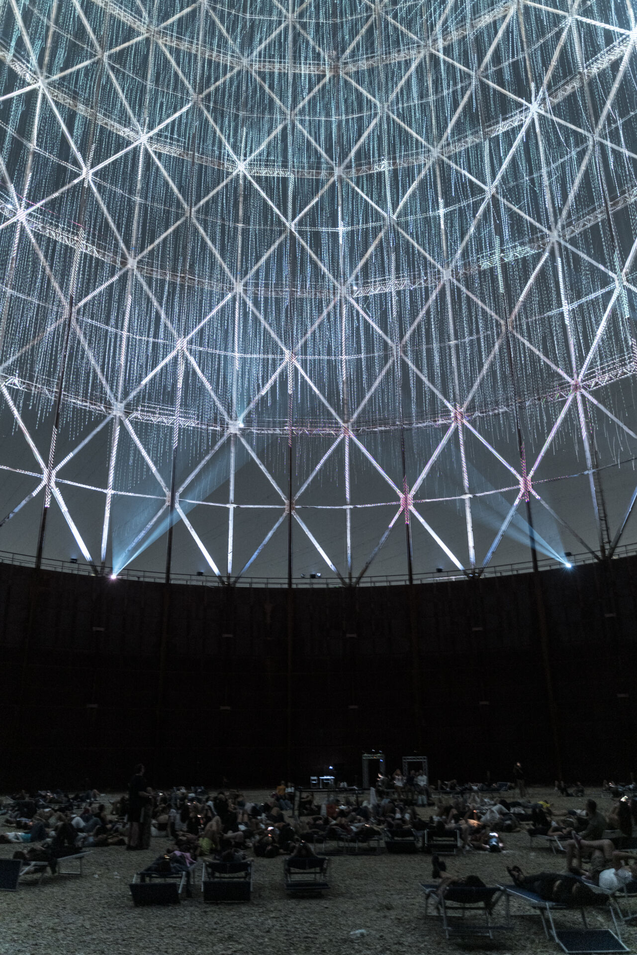 For Videocitt – they created an installation composed of four hundred thousand artificial stars that lit up the gigantic metal cylinder, seventy five metres high and with a surface of over three thousand square metres. The work was completed with original music composed specifically by Giorgio Moroder, pioneer of the synthesizer, three time Oscar winner, and recently awarded the David di Donatello for lifetime achievement. For this event, we went to interview the artists.