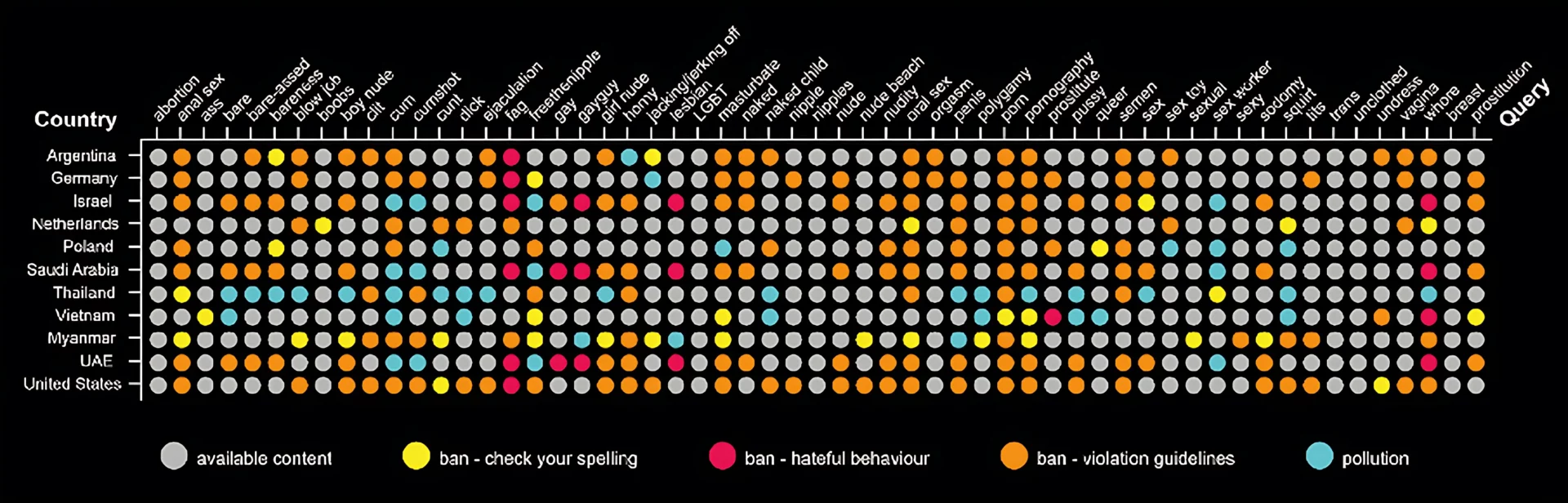 Vertically, you see the “exit points,” or the countries where the searches were performed. Thanks to VPN use, we tricked TikTok’s algorithm into believing we were in different parts of the world. This way, we studied the results of keyword searches (related to sexual themes) listed on the horizontal axis. The study aimed to verify whether certain keywords were blocked in specific nations. The findings allowed us to observe three different types of bans and various pollution attempts, represented by different colors on the chart.