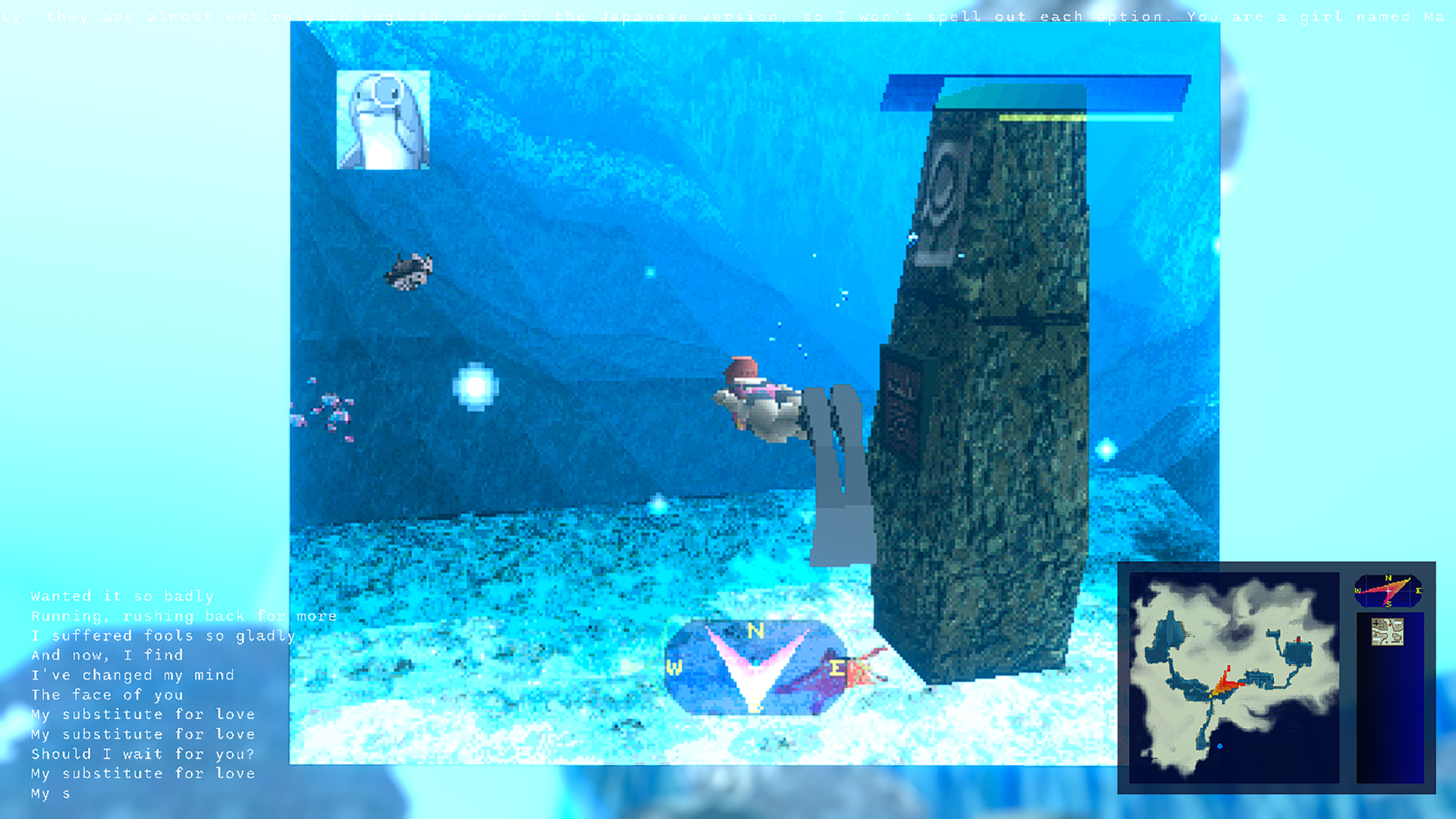 The video game d – tournements of plundercore and plunderludics can serve various purposes, some more political than others: estrangement, satire, reinterpretation of elements already present (perhaps subtly) in the original works, critique, and, especially in the case of plunderludics, the study of game mechanics and interactions. For example, the plunderludics game Water Level/b.l.u.e. EXPLORATION by Hatim “hatimb00” Benhsain is a playable poetic essay centred on the video game b.l.u.e.: Legend of Water by CAProduction and Hudson Soft Company (1998). The game is emulated within the new work using tools developed by the Plunderludics Working Group and mixed with assets from other games, texts, and songs, including Drowned World/Substitute for Love by Madonna. The result is a video game collage that not only introduces Western audiences to b.l.u.e.: Legend of Water, originally released only in Japan, but also expands into a psychedelic journey through the representation of aquatic worlds.