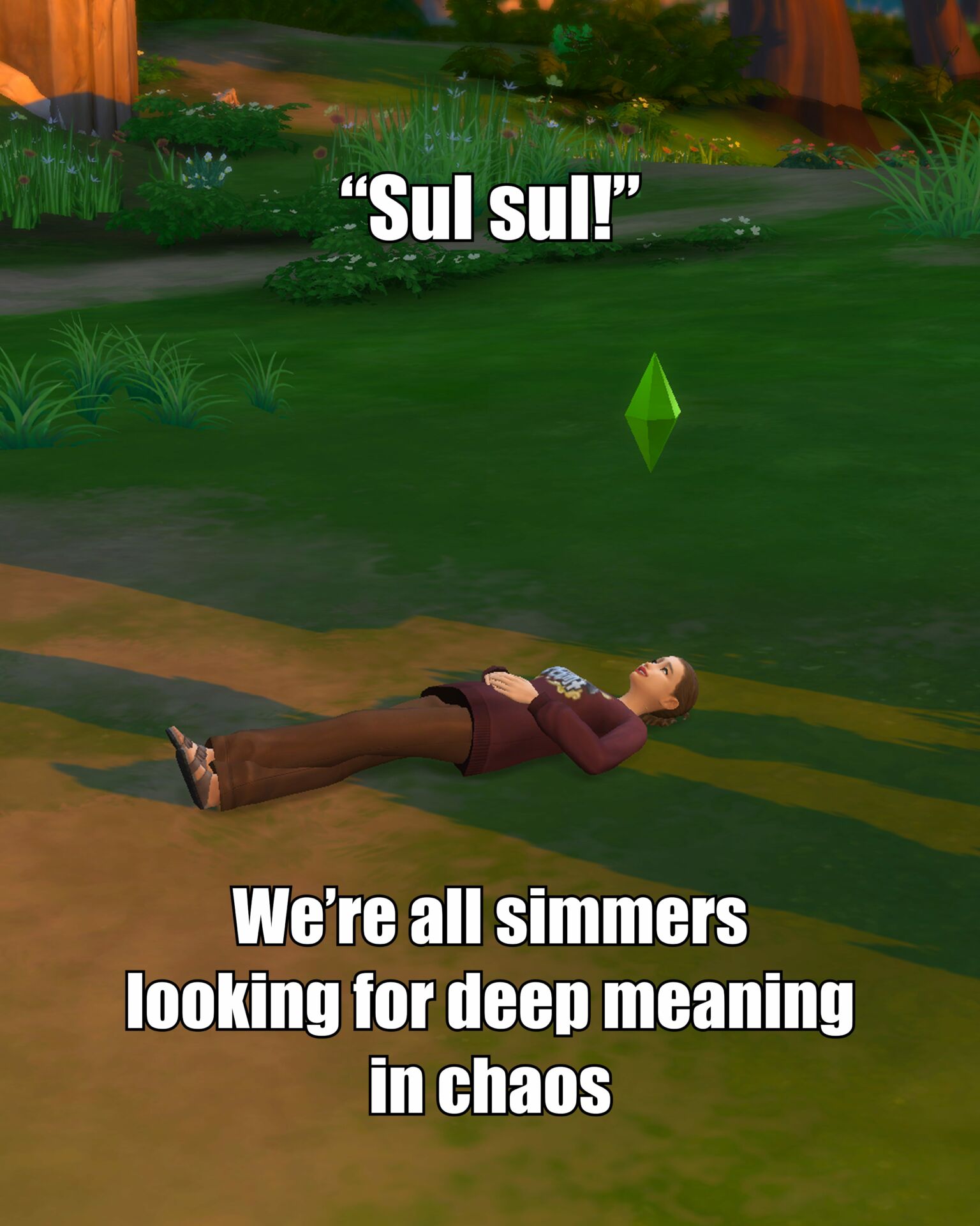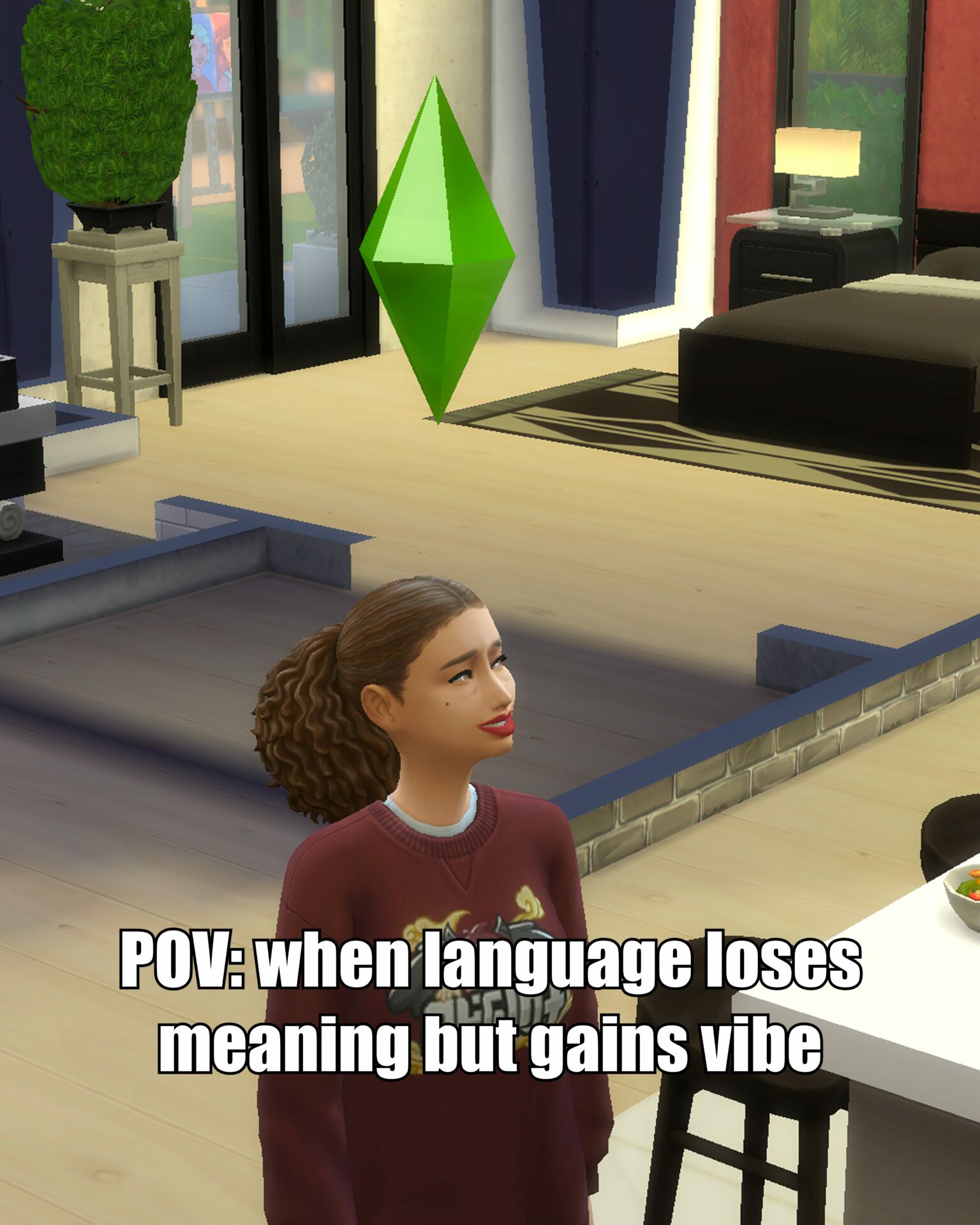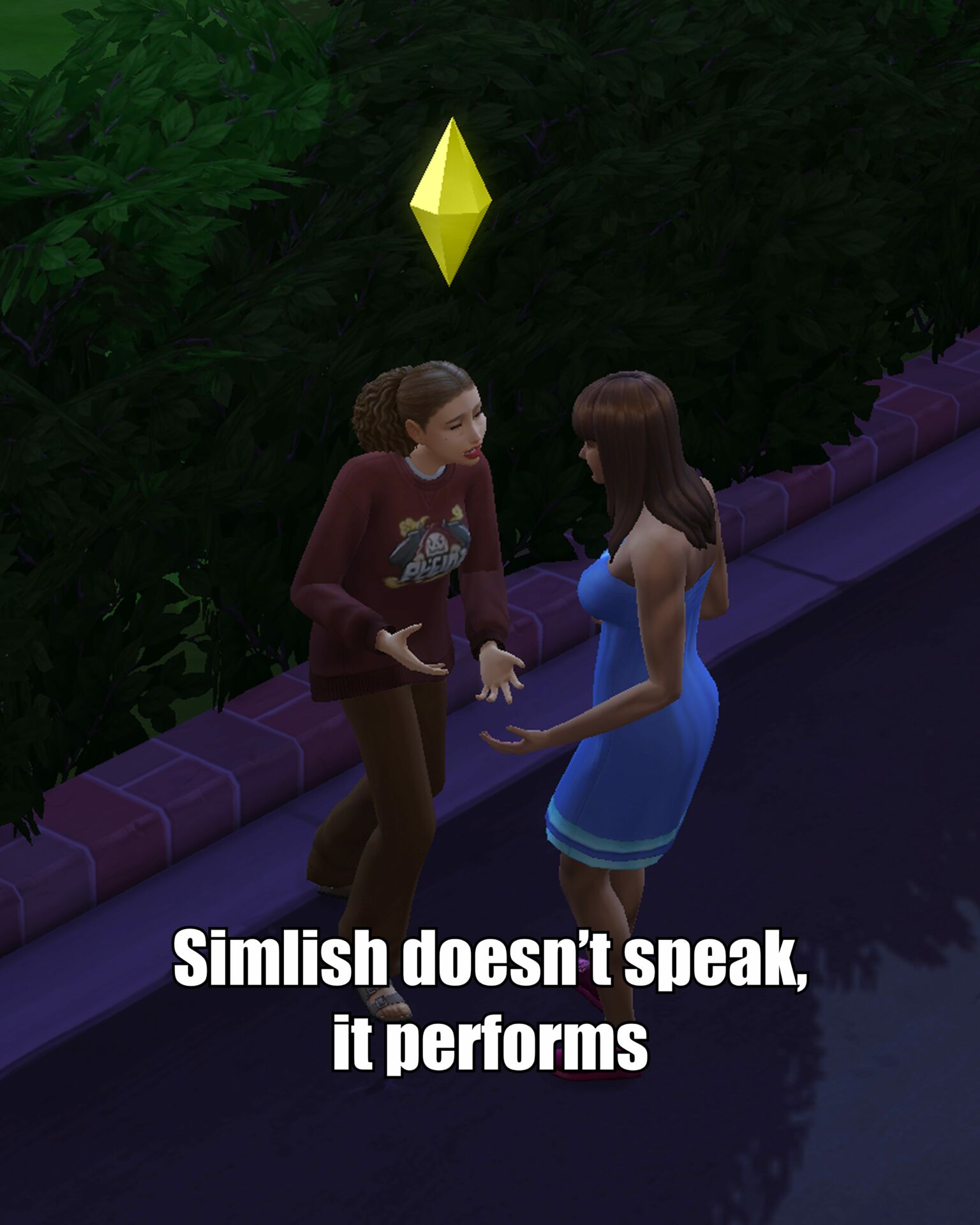 It is a performative language. Simlish presents itself as a linguistic device rooted in a radical post-linguistic tension. Its artificiality is not a limitation, but a resource – an aesthetic gesture that echoes the principles of asemic writing. In this grey area between code and chaos, Simlish does not try to “say”, but to evoke – to stimulate an affective and interpretative reaction. In this sense, it fits into post-structuralist reflections on the death of the author and the crisis of stable meaning: every Simlish utterance is simultaneously universal and unrepeatable, because it depends entirely on context, on gesture, on intonation, and above all on the eye of the player who observes. It is not a language that represents the world, but one that reinvents it. This condition opens a further space for reflection on the user’s subjectivity. If the avatar functions as a digital mirror – a double that does not faithfully reflect the image but distorts it – then the relationship between player and character hinges on recognition. Every emotion that the user projects onto the Sim is always a mirrored and deferred operation – a desire dressed as fiction, an identity explored through simulation. Language here becomes an opaque lens: instead of showing clearly, it allows glimpses; it transforms every interpretation into a creative act. Simlish, then, is not an obstacle to communication, but its most radical catalyst, because it demands a continual effort of imagination.