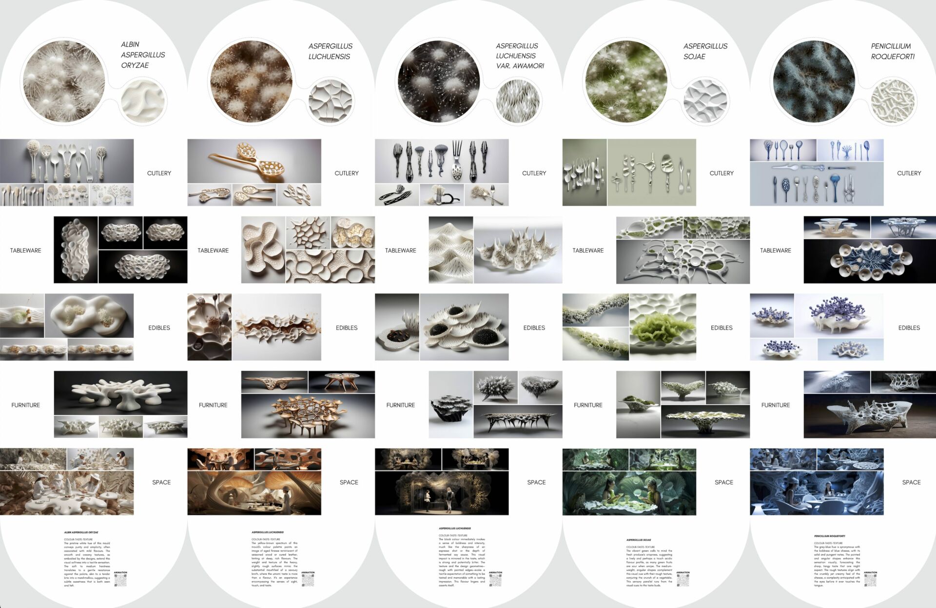 The Art of Taste exhibition combines architecture, biology, artificial intelligence and gastronomy. Presented at the Sikka Art and Design Festival 2024 in Dubai, the exhibition showcased the fusion of computational design with culinary arts, highlighting how technology can revolutionize food experiences. The event featured interactive installations and edible designs, offering visitors a multisensory journey that reimagined the future of culinary art through the lens of AI-driven design innovation. The study presented an integrative approach that merged the complex biological properties of five edible mouldsAspergillus oryzae, Aspergillus sojae, Aspergillus luchuensis, Aspergillus luchuensis var. awamori, and Penicillium roquefortiwith advanced design methodologies and processes. The taste and texture profiles associated with these moulds, informed the creation of AI-driven culinary artifacts. These artifacts encompassed cutlery, tableware, edible items, furniture and spatial designs, all aimed at enhancing the sensory experience of food.? The AI-generated designs featured uneven, tactile surfaces that blended the structural patterns of the moulds with their corresponding textures. The primary objective was to redefine the gastronomic experience by introducing bio-inspired design as a foundation for future phygital (physical-digital) food systems that engage in a dialogue with the environment and society. Additionally, the proposed spaces were tested through immersive virtual reality simulations to assess spatial configurations as a preliminary step toward prototyping. Subsequent phases of the project will involve digital fabrication, utilizing a workflow that combines AI image-to-3D modeling and parametric design tools, ultimately leading to a fully integrated phygital multisensory food experience.