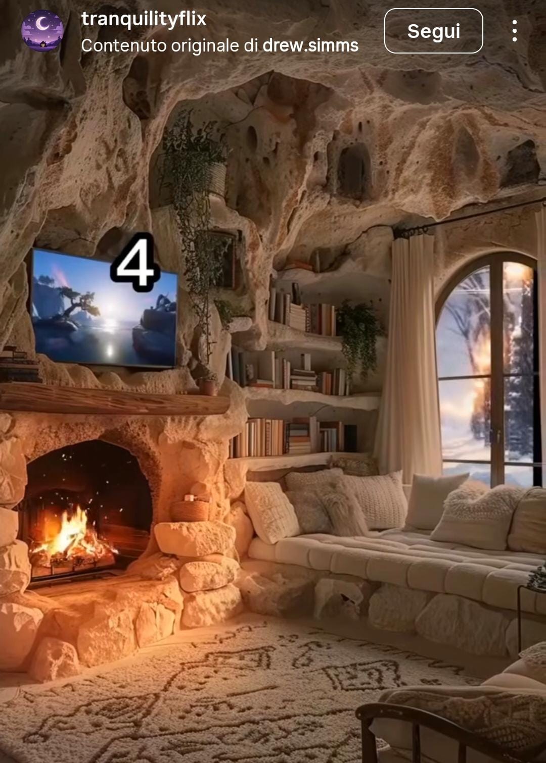 The videos I’m referring to are a sort of simplified personality test, where you’re simply asked to choose something, with no outcome or explanation: “If you know your boyfriend well, which of these houses would he choose?”, “You have to isolate for a year, which house do you pick?”, or “You haven’t slept in two days – which of these beds would you rest in?” The images that follow are AI-generated and numbered so viewers can choose. They depict homes set in different landscapes that match specific clich – s: desert, jungle, snowy mountain, forest, or big city. The interiors follow suit, idealizing absolute comfort with piles of cushions, giant screens, fireplaces lit while a storm rages outside. I’d call them visual ASMR – pages from a furniture catalog of another dimension.