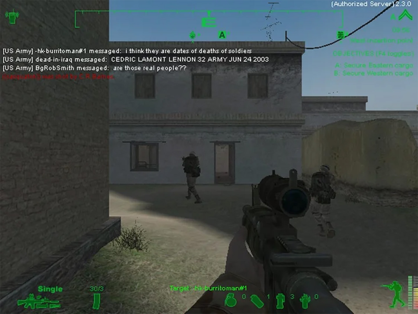 A different case is America’s Army (2002), a squad-based online first-person shooter developed with a commercially available game engine (Unreal Engine) directly by the U.S. Army itself to reach potential new recruits. As Colonel Casey Wardynski, project director, recounts in an interview also included in Joystick Soldiers, America’s Army was one of the responses to a collapse in enlistments. The goal was to reach a young audience, ages 13 and up, and familiarize them with the Army before they turned 17, the minimum age to enlist. “The game is involved in creating a better-prepared customer,” Wardynski explains. America’s Army is an advergame, a playable advertisement as part of a rebranding operation that brought the Army into popular culture: its success launched a series that continued until 2022.