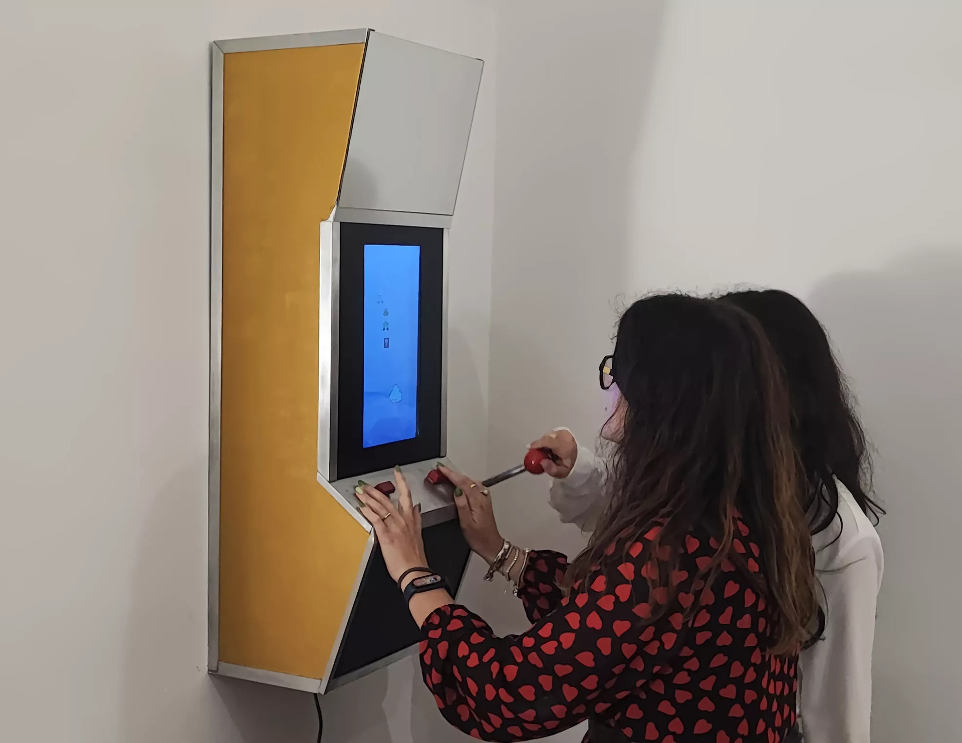 The chair is the coveted workplace: its comfortable but has wheels, and therefore demands a certain dynamism, the artist tells us. The start screen of Rab Sitting encourages us to reach these chairs, and to do so we can move Mario using three buttons and the slot-machine-style lever of the custom-built arcade cabinet that Ghidini assembled for the game. We try to figure out how it works, attempt after attempt, but whatever we do Mario seems destined to fall and die.