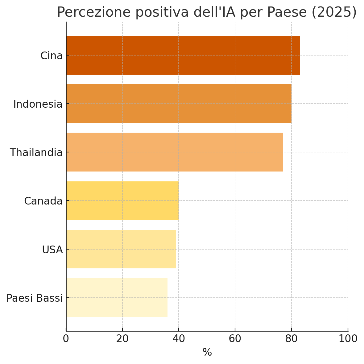Asian nations are leading a wave of global enthusiasm that sees technological innovation as a formidable tool for collective empowerment. In China, 83% of the population believes AI offers more benefits than risks, with similarly high levels in Indonesia (80%) and Thailand (77%) (Stanford HAI, The 2025 AI Index Report: Public Opinion, 2025).