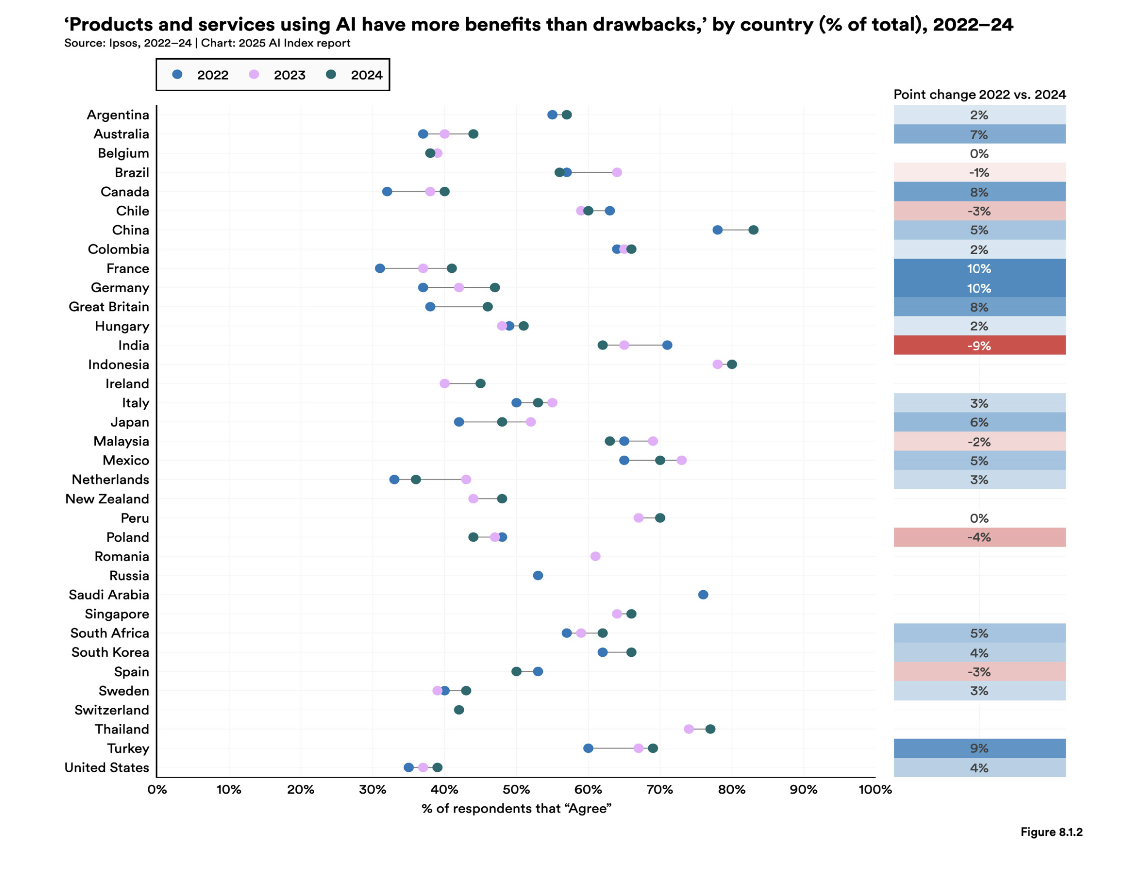 This trend suggests that prolonged exposure to the technology is shifting fear of the unknown into a more conscious pragmatism. Where daily experience proves the tool’s usefulness, even the most cautious populations begin to acknowledge its potential, —though not without maintaining ethical vigilance over digital developments. (Stanford HAI, The 2025 AI Index Report: Public Opinion, 2025).