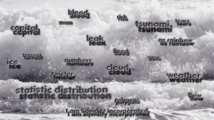 È il caso di Hito Steyerl, che con Liquidity Inc. (2014) affronta la natura sfuggente e interconnessa dei sistemi globali. La video-installazione mostra la storia di Jacob Wood, analista finanziario che, dopo aver perso il lavoro nel crollo del 2008, diventa lottatore di arti marziali miste. Con onde generate al computer e immagini di uragani, l’opera usa l’acqua e il meteo estremo come metafore della fluidità dei beni finanziari, delle informazioni digitali e dell’instabilità collettiva: il concetto di “liquidità” descrive l’instabilità delle economie globali e delle trasformazioni ambientali, presentandole come iperoggetti che non possono essere contenuti o spiegati da narrazioni lineari. Così, l’opera diventa una riflessione su come la tecnologia digitale possa simulare l’esperienza di trovarsi immersi in sistemi troppo grandi per essere compresi.